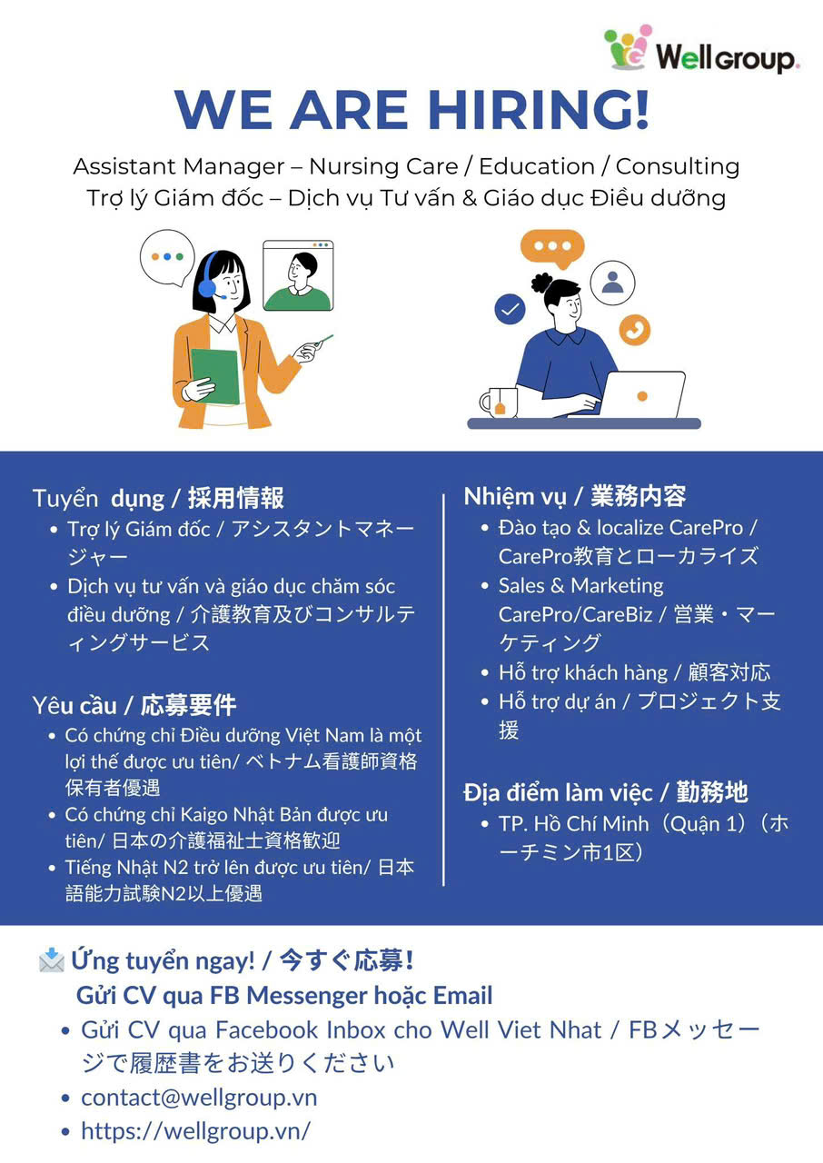 Chúng tôi đang tích cực tuyển dụng những người có kinh nghiệm chăm sóc tại Nhật Bản (thực tập sinh kỹ năng cũ, kỹ năng đặc định, v.v.). Hãy cùng chúng tôi nâng cao dịch vụ chăm sóc tại Việt Nam bằng kinh nghiệm của bạn tại Nhật Bản.
